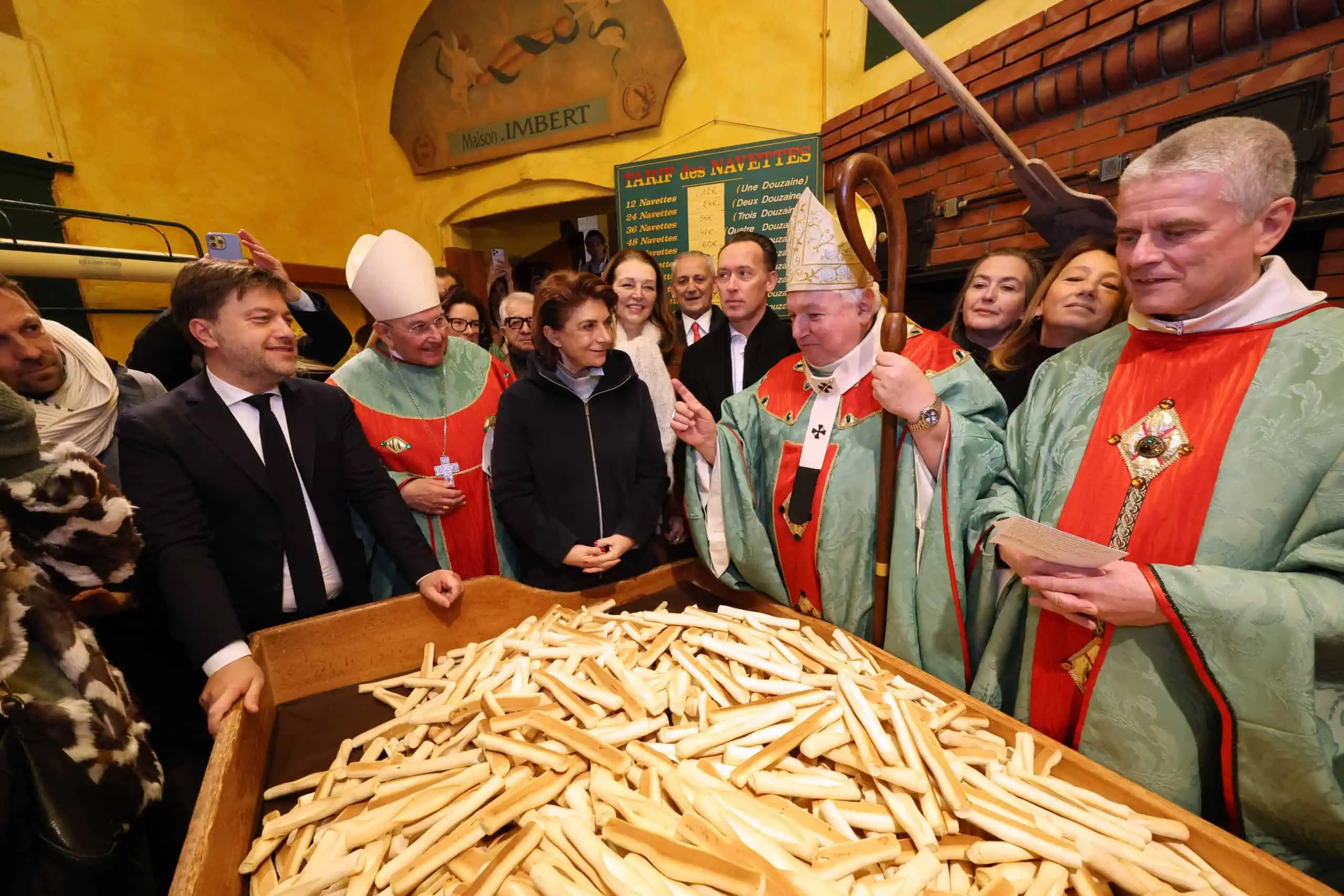 Sous le regard de Nicolas Imbert, propriétaire du Four des navettes, de Benoît Payan et de Martine Vassal, Mgr Aveline s'apprête à bénir les navettes pour la Chandeleur.